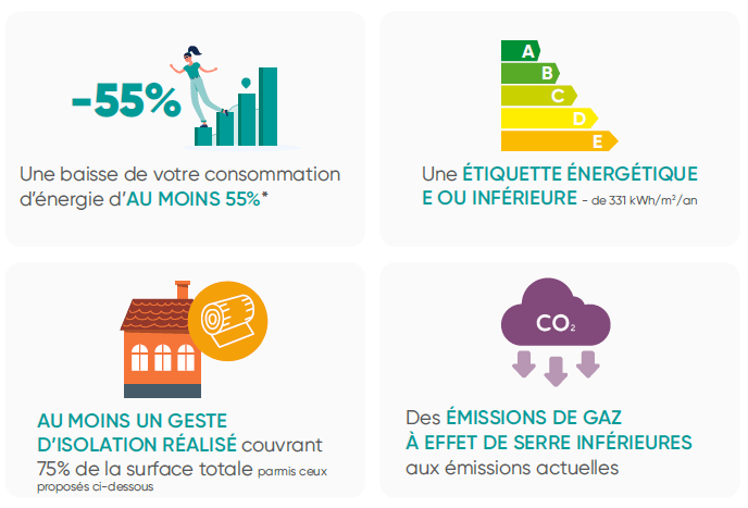 Pour bénéficier de l’offre Coup de Pouce Rénovation Globale Maison Individuelle, vous devez engager des travaux qui permettront à votre logement d’atteindre :